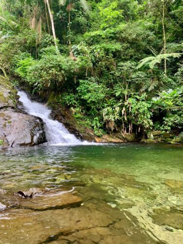 Trilha com 3 quedas principais e várias piscinas naturais. Uma das mais conhecidas do litoral, ideal para um passeio em meio ao verde e banhos gelados.